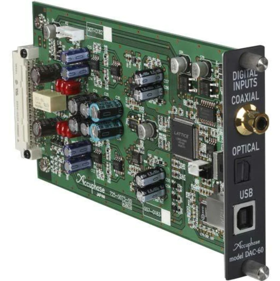 DAC-60 je digitálna vstupná doska, ktorá môže vkladať digitálne signály priamo do zosilňovacích jednotiek, keď je inštalovaná v predzosilňovačoch Accuphase a integrovaných zosilňovačoch.