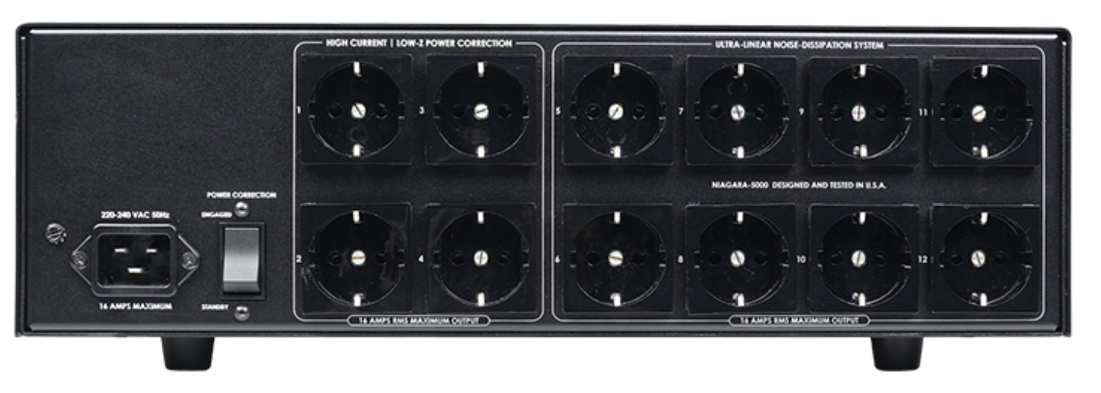 Niagara 5000EU disponuje štyrmi napájacími zásuvkami "HIGH-CURRENT / LOW-Z POWER CORRECTION" . Tieto zásuvky sú vybavené technológiou Transient Power Correction a sú navrhnuté tak, aby sa pomocou nízko-impedančnej prúdovej rezervy pre špičky maximalizoval výkon napájaných výkonových zosilňovačov. Bez ohľadu na triedu prevádzky (zosilňovače triedy A, A/B, G, D atď.) alebo topológiu obvodov (elektronkové, tranzistorové, digitálne, alebo iné), obvody pre prechodnú korekciu výkonu nebudú komprimovať napájanie akéhokoľvek pripojeného výkonového zosilňovača. Práve naopak, výkon zosilňovača sa zlepší vďaka napájaniu prúdom s nízkou impedanciou, ktoré každý zosilňovač tak zúfalo potrebuje.