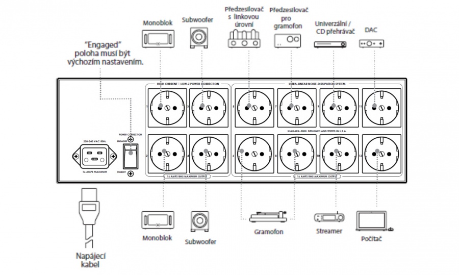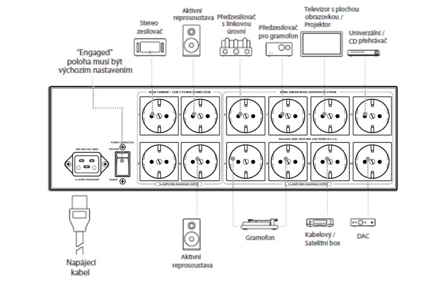 Na pripojenie DAC prevodníka a/alebo univerzálneho prehrávača v jednej izolovanej skupine, predzosilňovača a gramofónu v inej skupine, ale aj na pripojenie ďalších digitálnych zariadení a video produktov, ponúka Niagara 5000EU 8 zásuviek v dvoch oddelených skupinách so systémom Ultra-Linear Noise-Dissipation (ultra-lineárny systém pre rozptýlenie šumu). Tieto obvody nikdy netrpia aktuálnou kompresiou, ale ich nižšia vstupná úroveň a vyšší zisk vyžadujú robustnejší spôsob rozptýlenia šumu. Kľúčovou vlastnosťou diskrétnych AC zásuviek na jednotke Niagara 5000EU je, že sa s jednotlivými okruhmi nezaobchádza rovnako, ale každá skupina zásuviek je optimalizovaná pre najlepší výkon pripojených zariadení.