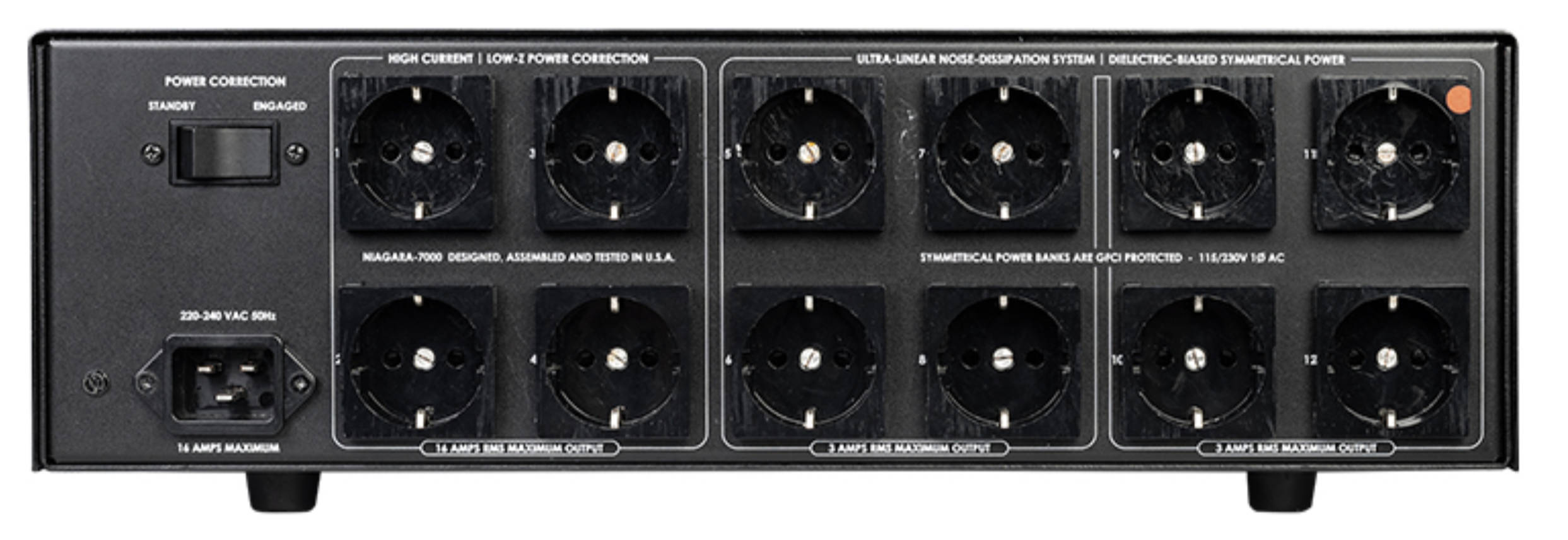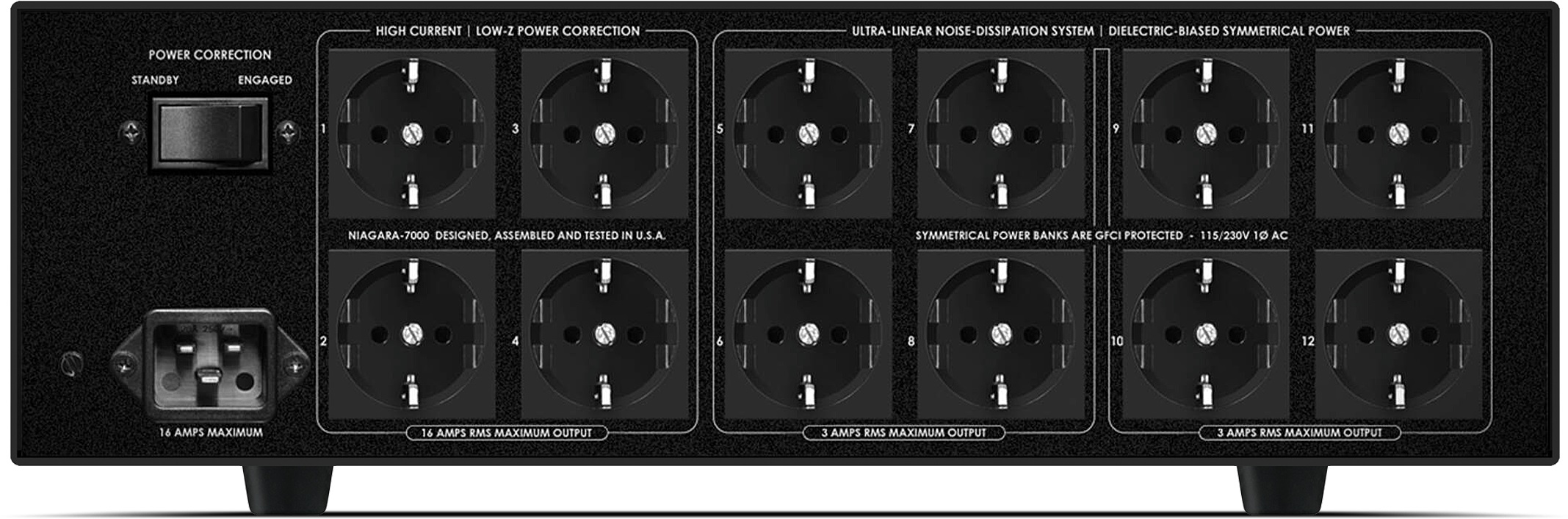 Niagara 7000EU disponuje štyrmi napájacími zásuvkami "HIGH-CURRENT / LOW-Z POWER CORRECTION". Tieto zásuvky sú vybavené technológiou Transient Power Correction a sú navrhnuté tak, aby sa pomocou nízko-impedančnej prúdovej rezervy pre špičky maximalizoval výkon napájaných výkonových zosilňovačov. Bez ohľadu na triedu prevádzky (zosilňovače triedy A, A/B, G, D, atď.) alebo topológiu obvodov (elektronkové, tranzistorové, digitálne, alebo iné), obvody pre prechodnú korekciu výkonu nebudú komprimovať napájanie akéhokoľvek pripojeného výkonového zosilňovača. Práve naopak, výkon zosilňovača sa zlepší vďaka napájaniu prúdom nízkou impedancií, ktoré každý zosilňovač tak zúfalo potrebuje.