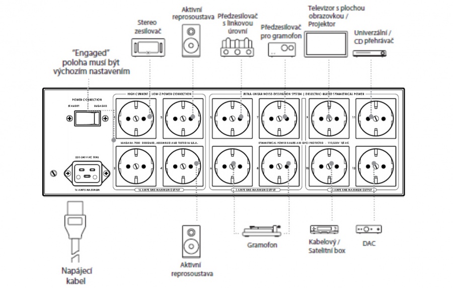Jedinečný obvod Transient Power Correction poskytuje prúdovú rezervu viac ako 80 a pre prúdové špičky, je špeciálne navrhnutý na napájanie moderných výkonových zosilňovačov. Väčšina striedavých napájacích zdrojov s "High-Current" zásuvkami iba minimalizuje prúdovú kompresiu; Niagara 7000EU ju opraví.