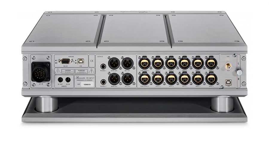 Kryt modelu 077 z radu Reference Line zaujme hneď na prvý pohľad výnimočným spracovaním a robustnou hliníkovou konštrukciou. Predzosilňovač je umiestnený na špeciálnej základni s uhlíkovými tlmiacimi prvkami, ktoré mechanicky izolujú zariadenie od akéhokoľvek rušenia a umožňujú jeho mimoriadne spracovanie signálu. Ako ultimátne vylepšenie ponúka Burmester externú napájaciu jednotku pre model 077.