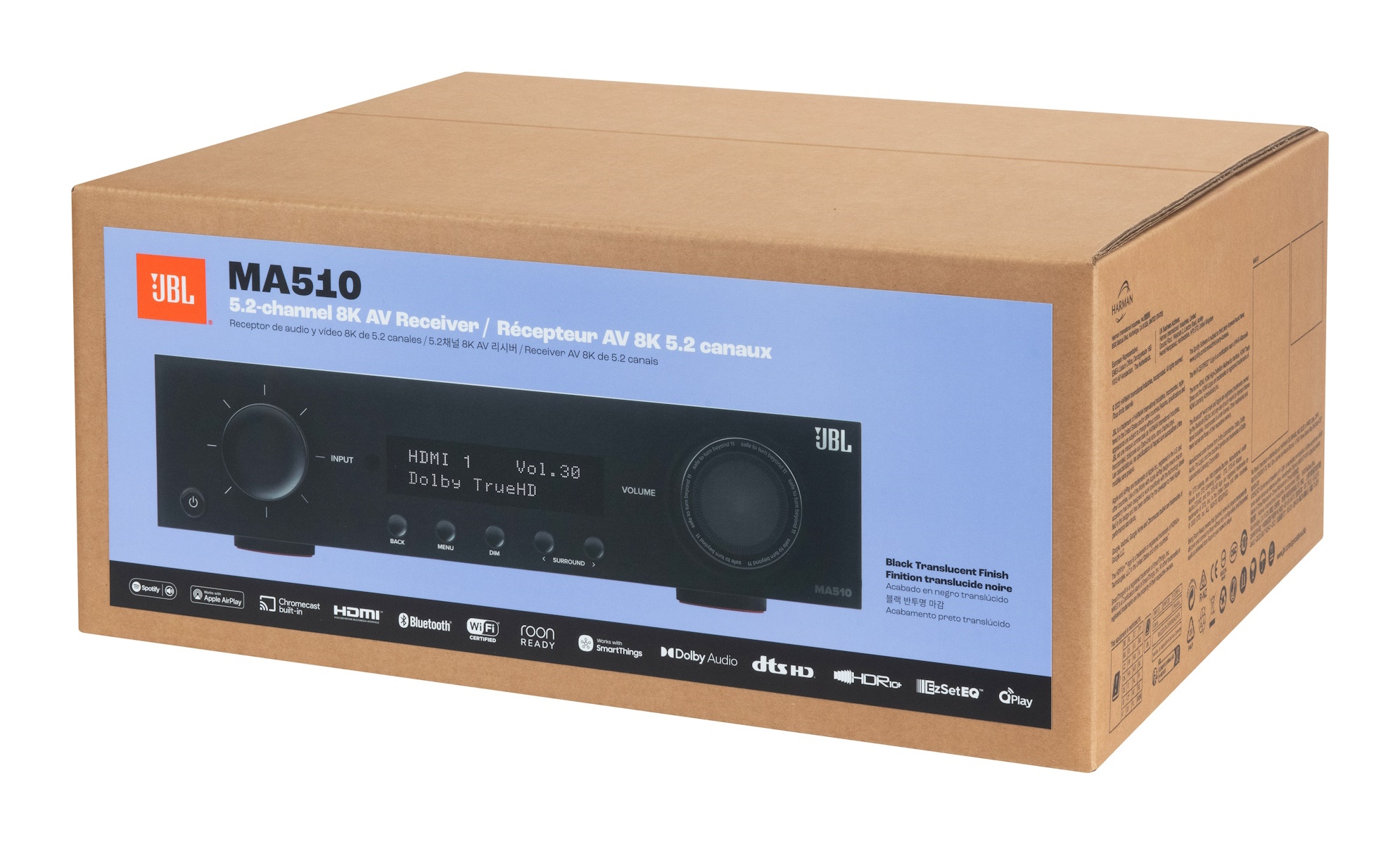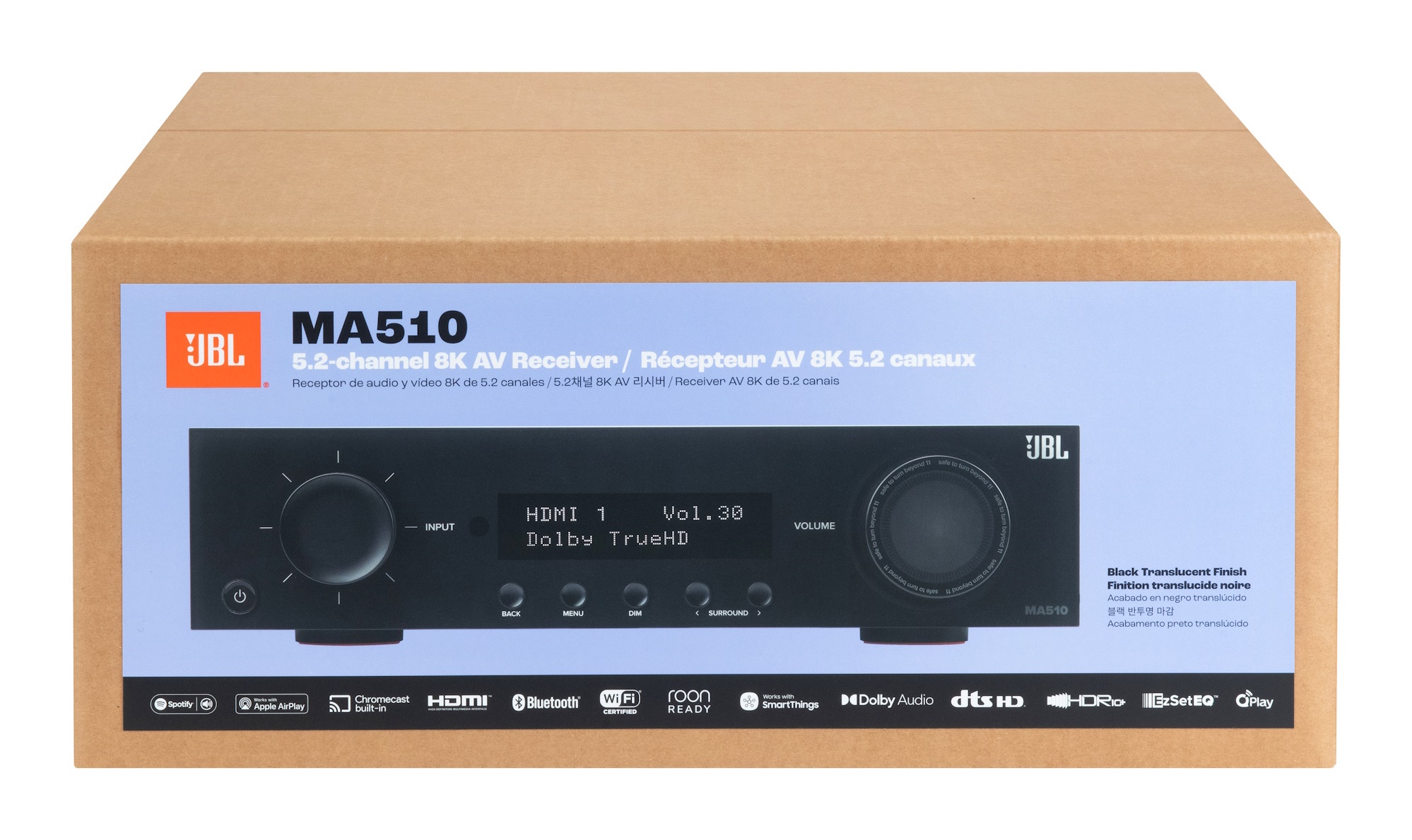 JBL MA510 je najnižší model z radu AV zosilňovačov JBL, ktorý podporuje 8K video vrátane formátov s vysokým dynamickým rozsahom kontrastu Dolby Vision a HDR 10+ . Majitelia najvýkonnejších herných zariadení ich môžu pripojiť priamo k niektorému zo 4 vstupov HDMI verzie 2.1 s prenosovou rýchlosťou až 40 Gbps. Okrem 8K @ 60 Hz videá ocenia pri hraní najnáročnejších hier aj kompatibilitu 4K s obnovovacou frekvenciou 120 Hz, ktorá zaistí plynulý pohyb UHD obrazu pri gamingu, ultrarýchlom pohybe, športe alebo v akčných filmoch. Herné ambície podčiarkuje aj podpora technológií ALLM, QFT a VRR (Variable refresh rate), pretože o strý obraz je nutný pre vysoko výkonné hry, ktoré z variabilnej obnovovacej frekvencie 120 Hz významne ťažia.