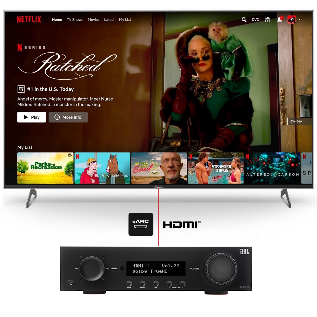 Súčasné inteligentné televízory sa stávajú stredobodom domácej zábavy. Vďaka YOUTUBE a streamovacím službám ako sú NETFLIX, HBO, DISNEY+ a O2TV má užívateľ prostredníctvom televízora okamžitý prístup k neobmedzenej ponuke videí, filmov aj hudby. Televízor môže byť súčasne prepojený aj s hernou konzolou, smartfónom, multimediálnym centrom alebo počítačom . Hoci tieto zariadenia bežne poskytujú viackanálový priestorový zvuk Dolby a DTS , neplatí to o interných reproduktoroch televízora. Skutočne realistický pohlcujúci a obklopujúci zvuk a skutočný zážitok zo sledovania filmu alebo hrania hier umožňuje až pripojenie AV procesora a zosilňovača so systémom reproduktorov. JBL MA510 je najjednoduchším spôsobom, ako zo svojej obývačky vytvoriť naozajstný kinosála. Stačí ho prepojiť s televízorom jediným káblom HDMI eARC a začať využívať všetky jeho možnosti.