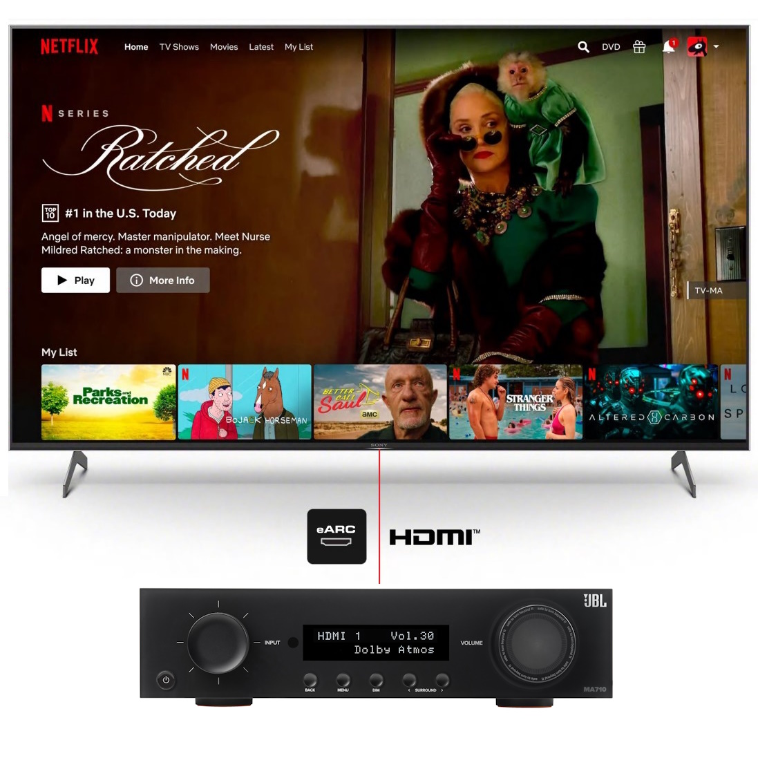 Súčasné inteligentné televízory sa stávajú stredobodom domácej zábavy. Vďaka YOUTUBE a streamovacím službám ako sú NETFLIX, HBO, DISNEY+ a O2TV má užívateľ prostredníctvom televízora okamžitý prístup k neobmedzenej ponuke videí, filmov aj hudby. Televízor môže byť súčasne prepojený aj s hernou konzolou, smartfónom, multimediálnym centrom alebo počítačom . Hoci tieto zariadenia bežne poskytujú viackanálový priestorový zvuk Dolby ATMOS a DTS-X , neplatí to o interných reproduktoroch televízora. Skutočne realistický pohlcujúci a obklopujúci zvuk a skutočný zážitok zo sledovania filmu alebo hrania hier umožňuje až pripojenie AV procesora a zosilňovača so systémom reproduktorov. JBL MA710 je najjednoduchším spôsobom, ako zo svojej obývačky vytvoriť naozajstný kinosála. Stačí ho prepojiť s televízorom jediným káblom HDMI eARC a začať využívať všetky jeho možnosti.