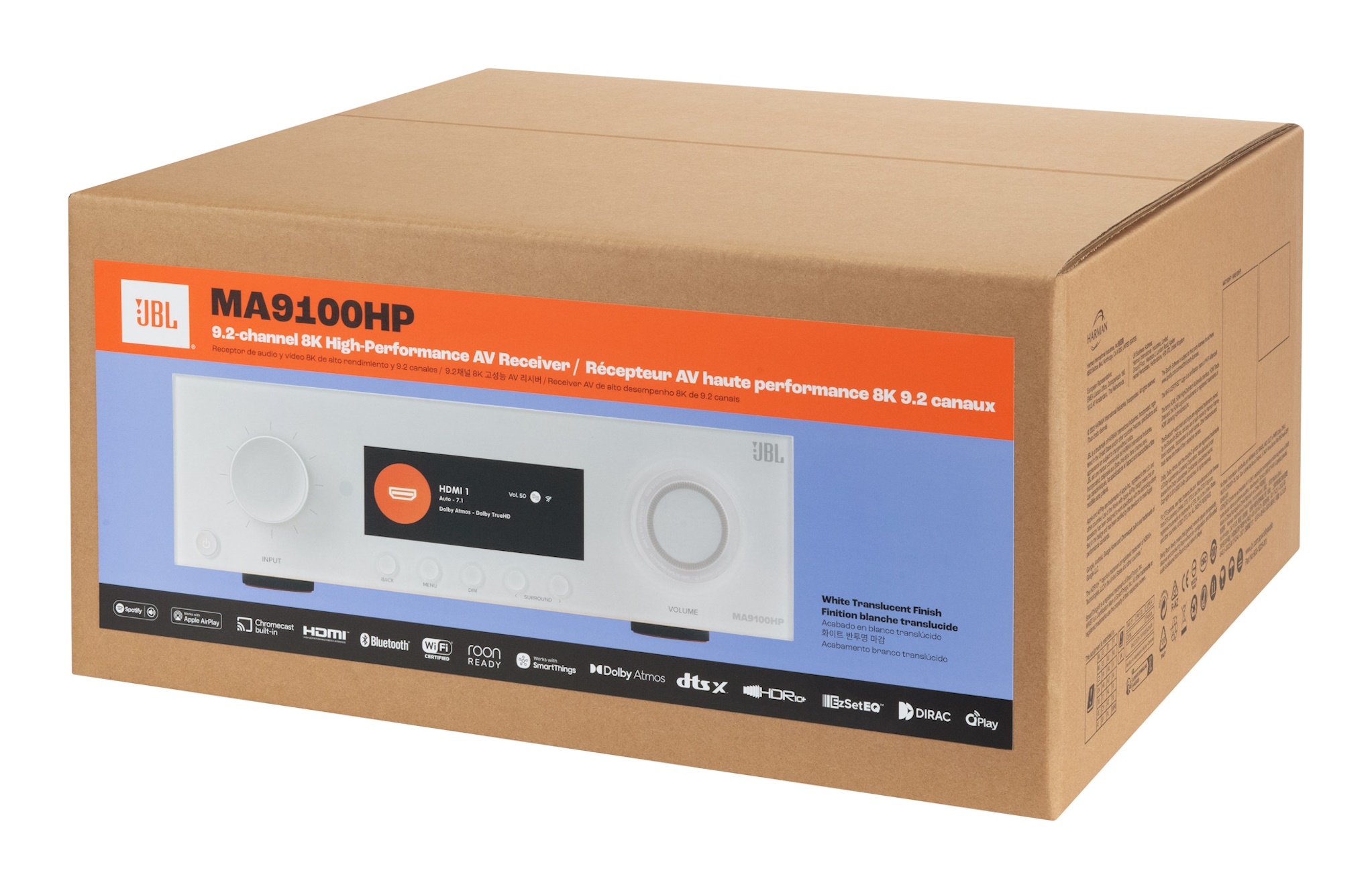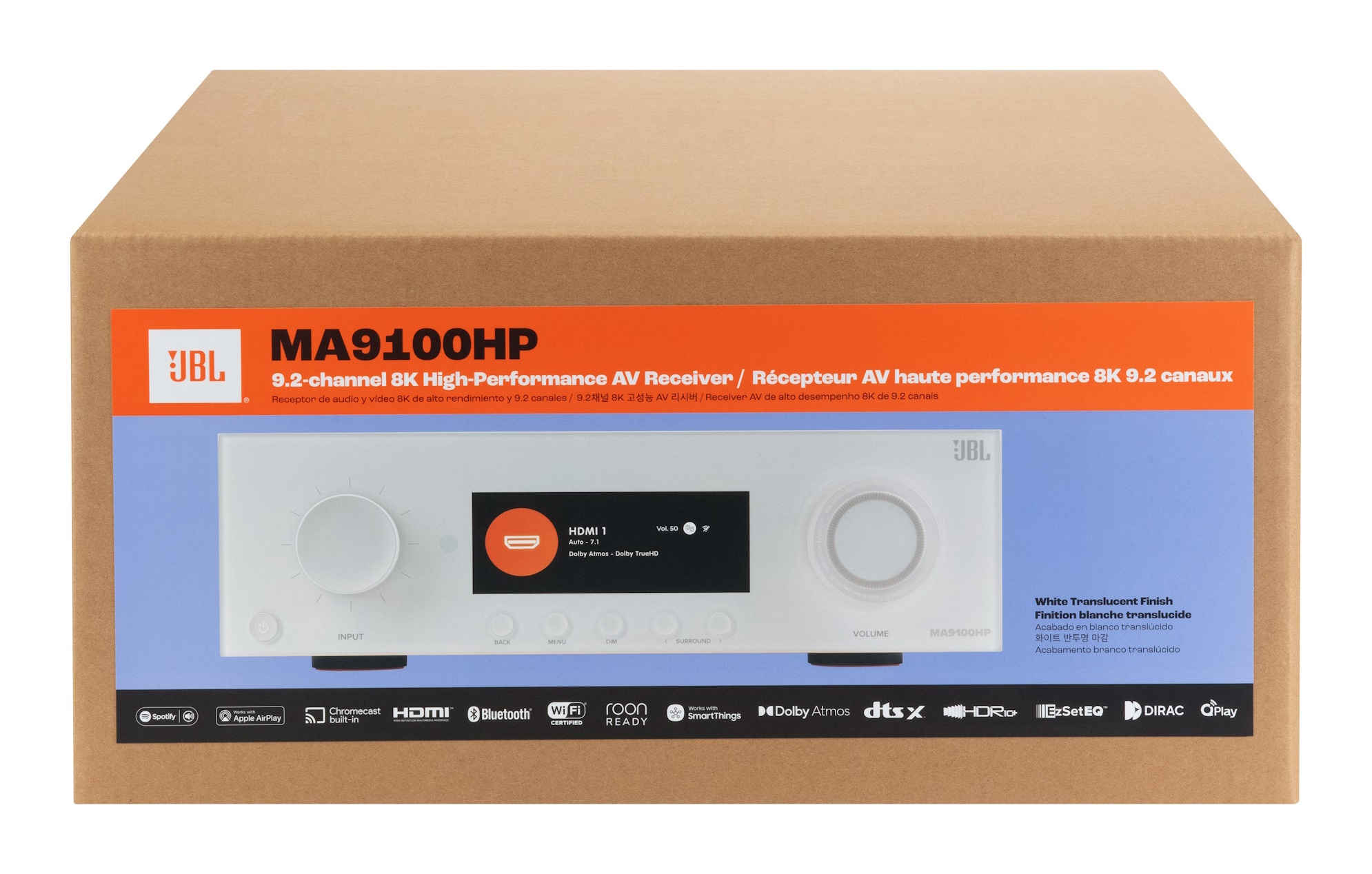 JBL MA9100HP je vlajkovou loďou z radu AV zosilňovačov JBL. Je navrhnutý pre najnáročnejších zákazníkov, ktorí vyžadujú absolútnu dokonalosť a nerobia kompromisy a ako jediný z radu MA ponúka okrem vyššieho výkonu aj zosilnenie až 9 kanálov. Je kompatibilný s technológiou priestorového zvuku Dolby ATMOS a DTS-X. Podporuje 8K video vrátane formátov s vysokým dynamickým rozsahom kontrastu Dolby Vision a HDR 10+. Majitelia najvýkonnejších herných zariadení ich môžu pripojiť priamo k niektorému zo vstupov HDMI verzie 2.1 s prenosovou rýchlosťou až 40 Gbps. Okrem 8K @ 60 Hz videá ocenia pri hraní najnáročnejších hier aj kompatibilitu 4K s obnovovacou frekvenciou 120 Hz, ktorá zaistí plynulý pohyb UHD obrazu pri gamingu, ultrarýchlom pohybe, športe alebo v akčných filmoch. Herné ambície podčiarkuje aj podpora technológií ALLM, QFT a VRR (Variable refresh rate), pretože o strý obraz je nutný pre vysoko výkonné hry, ktoré z variabilnej obnovovacej frekvencie 120 Hz významne ťažia.