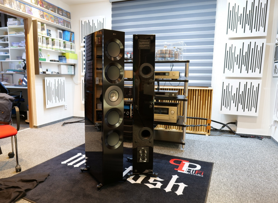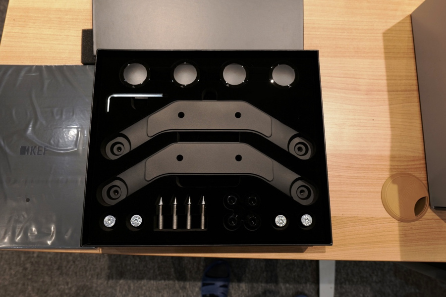 Reproduktory sú bezpečne zabalené, prepravná hmotnosť je okolo 64kg na kus. Samotné rozbaľovanie je radosť, rozhodne spoznáte, že je vo vnútri niečo referenčné. Krabička s hrotmi a podložkami je dôkazom precíznosti, ktoré sú u KEF dlhodobo poznávacím znamením.