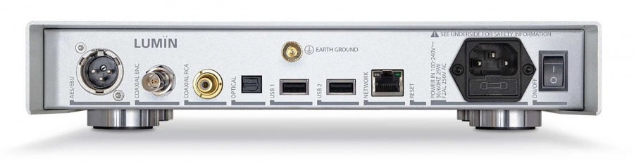 Potom dva USB konektory, ktoré slúžia ako vstup Flash diskov alebo externých harddiskov a samozrejme aj ako výstup pre spojenie s externými DA prevodníkmi. USB digitálne audio výstupy podporujú natívne DS512 aj PCM384 kHz. Vedľa je vstup LAN pre spojenie s routerom a resetovacie tlačidlo. Nad konektormi USB je tiež dôležitý konektor na uzemnenie. Úplne vpravo sa nachádza IEC 320 konektor pre napájací kábel a vedľa neho prepínač pre zapnutie a vypnutie prístroja.