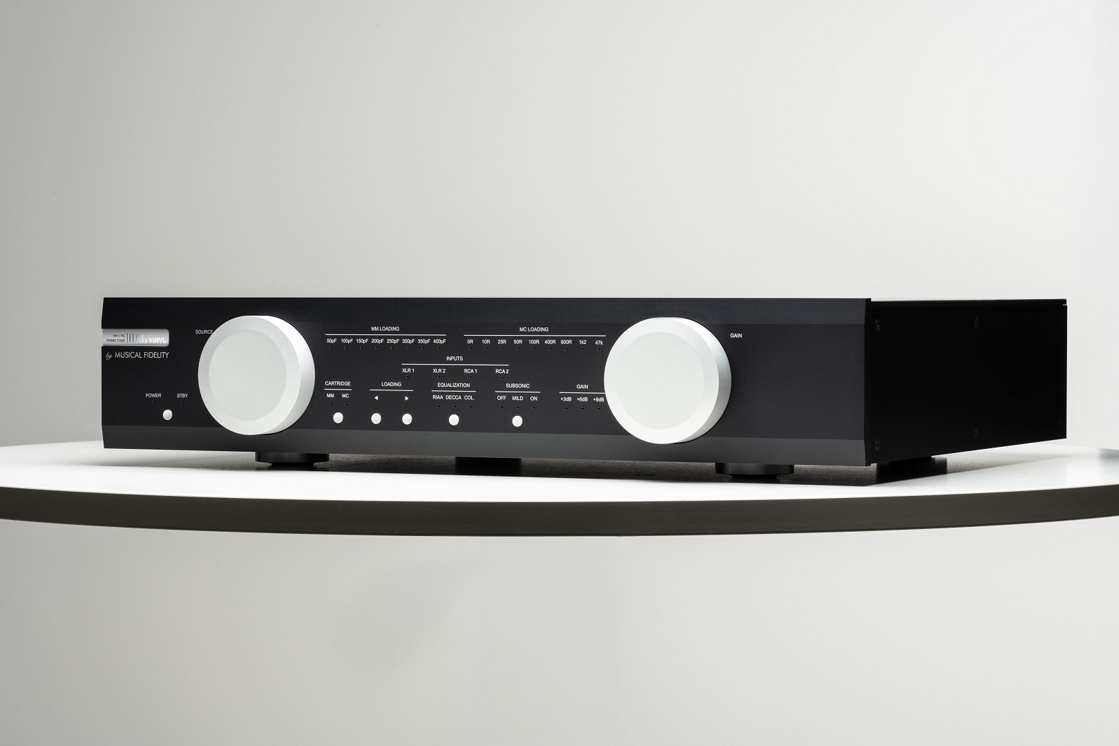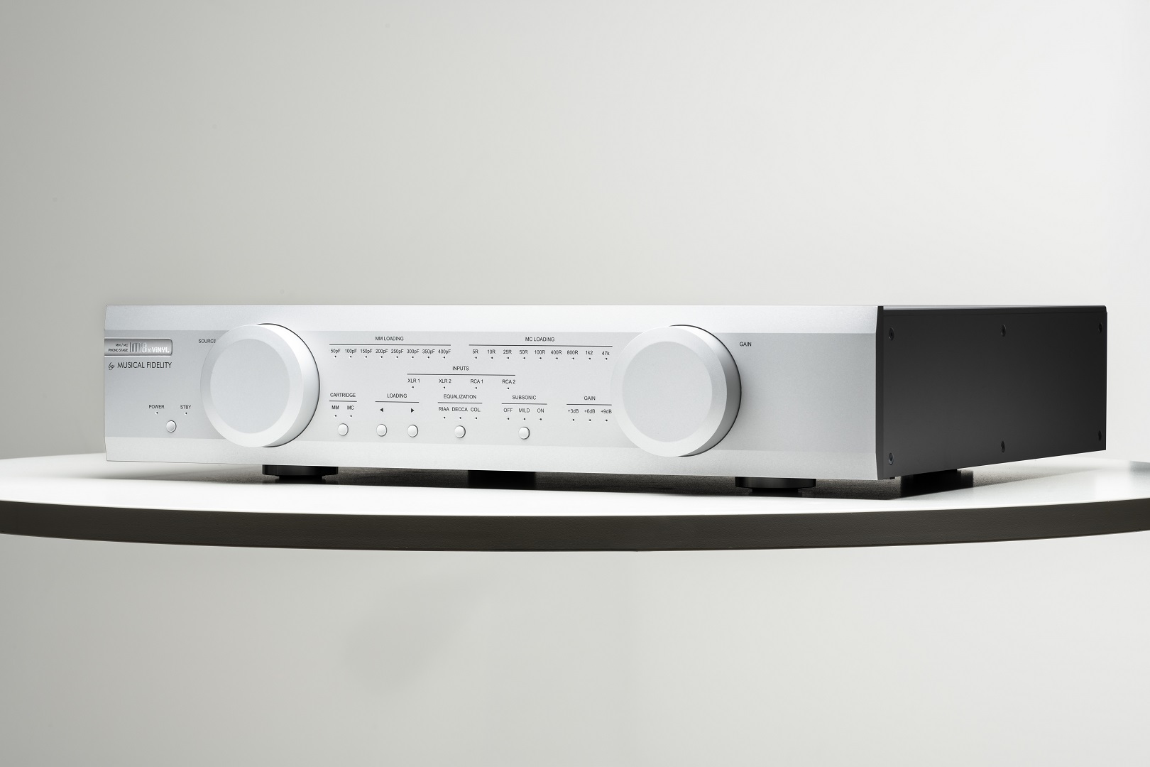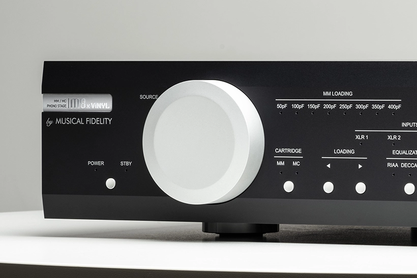 Model M8x Vinyl má masívne, precízne spracované celohliníkové šasi, navrhnuté v duchu radu M8 – vrátane použitia veľkých ovládacích prvkov, ktoré podčiarkujú jeho dôstojný, elegantný vzhľad. Perfektne tak ladí s ostatnými komponentmi radu M8.