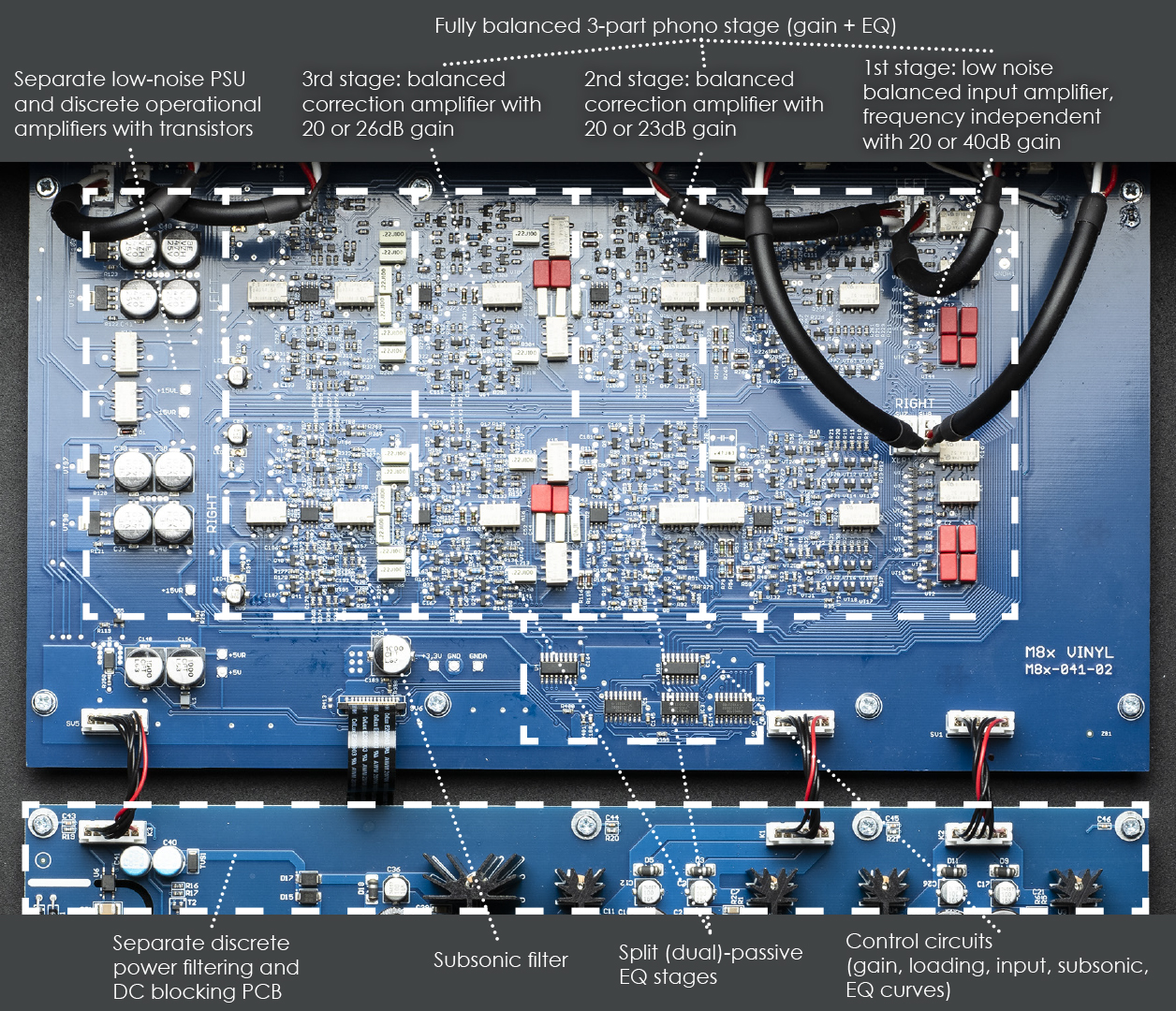 Ekvalizačný obvod M8x Vinyl rozhodne nešetrí na detailoch - je úplne pasívny a rozdelený do dvoch samostatných sekcií (tzv. split-passive). Tento spôsob je síce náročnejší na návrh aj realizáciu, ale zaisťuje najpresnejší priebeh ideálnej EQ krivky. Rozdelenie na dve fázy umožňuje lepšie prispôsobenie impedancie a minimalizuje odchýlky od požadovanej ekvalizačnej charakteristiky. Okrem bežnej RIAA krivky podporuje M8x Vinyl aj menej obvyklé DECCA a COLUMBIA .