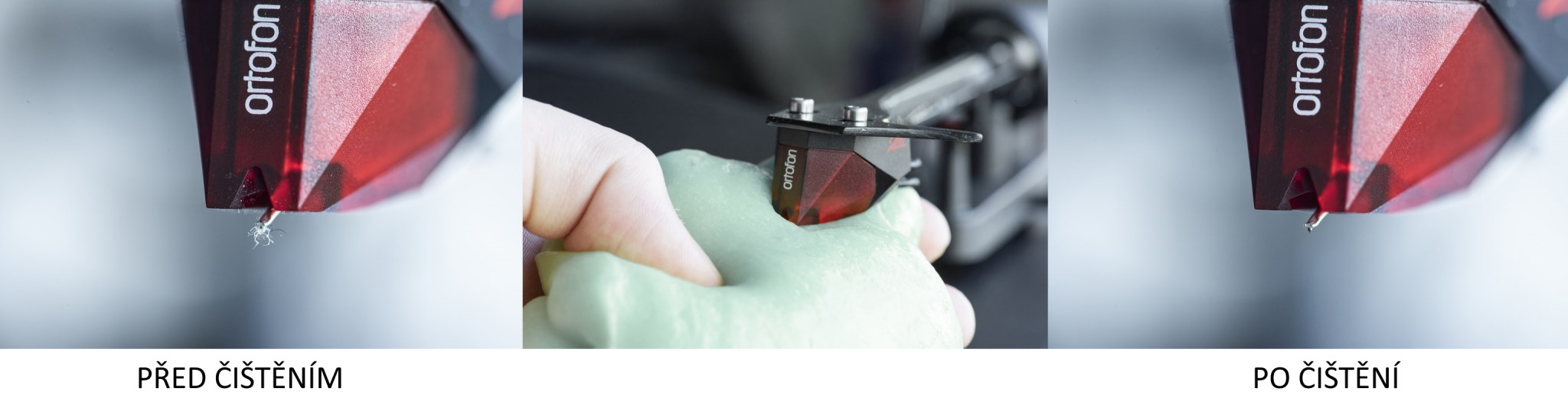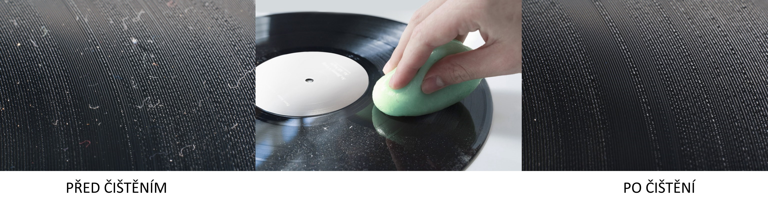 Pri čistení sa nesnažte čistené miesta utierať, iba jemne hmotu natlačte na vinylovú dosku alebo veľmi opatrne zatlačte hmotu na hrot prenosky.