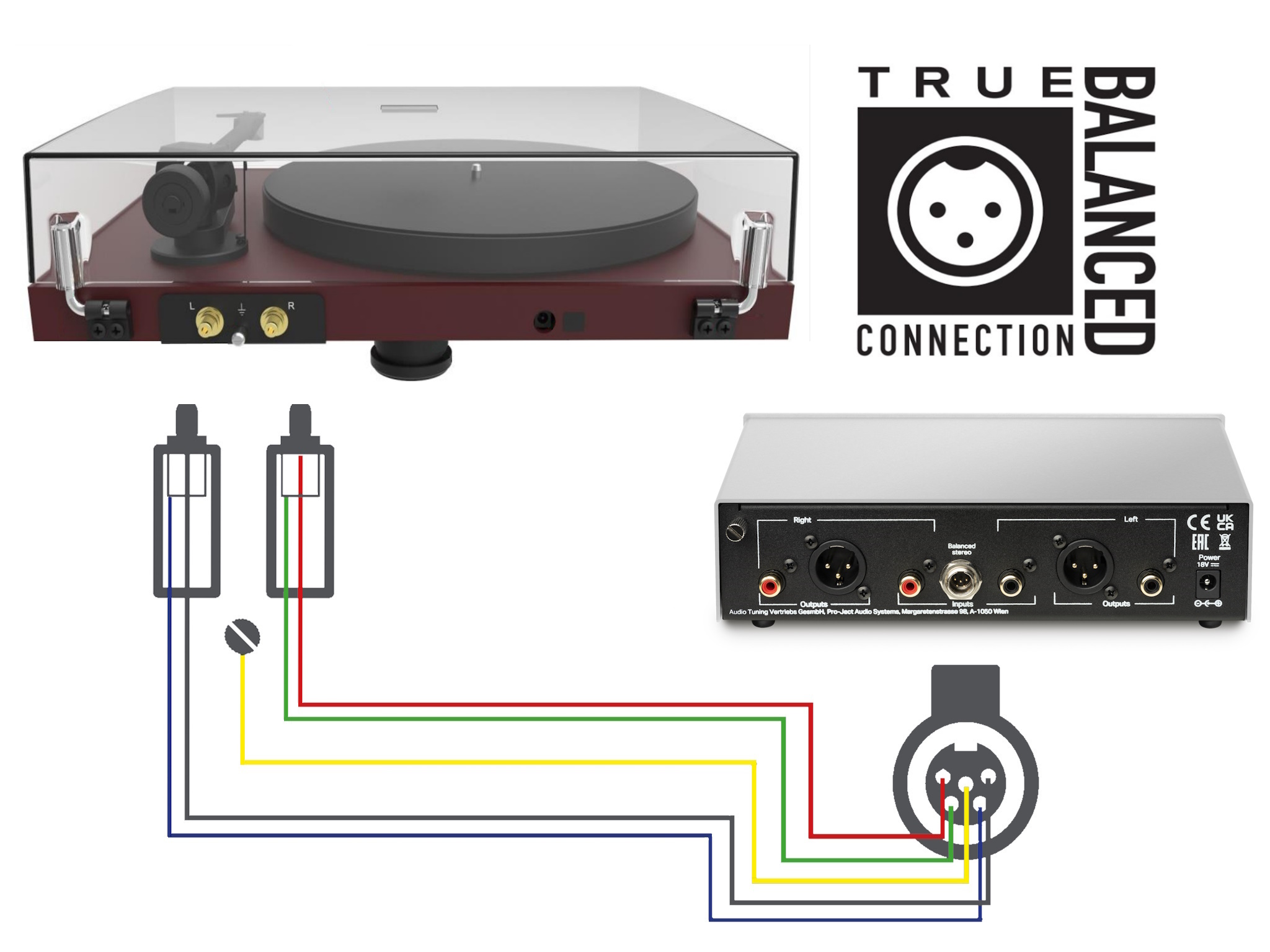 Špeciálny symetrický kábel s konektormi RCA na mini XLR je možné dokúpiť ako samostatné príslušenstvo). Napr. Connect it Phono E , Connect it phono S alebo Connect it Phono DS . Tieto káble sú optimalizované pre symetrické zapojenie gramofónov Pro-Ject v spojení s kompatibilným plne symetrickým gramofónovým predzosilňovačom ako sú Pro-Ject Phono Box DS3, Tube Box DS3 alebo Phono Box S3. Viac o možnostiach symetrického zapojenia gramofónu nájdete v informačnom materiáli uloženom v sekcii "Na stiahnutie".