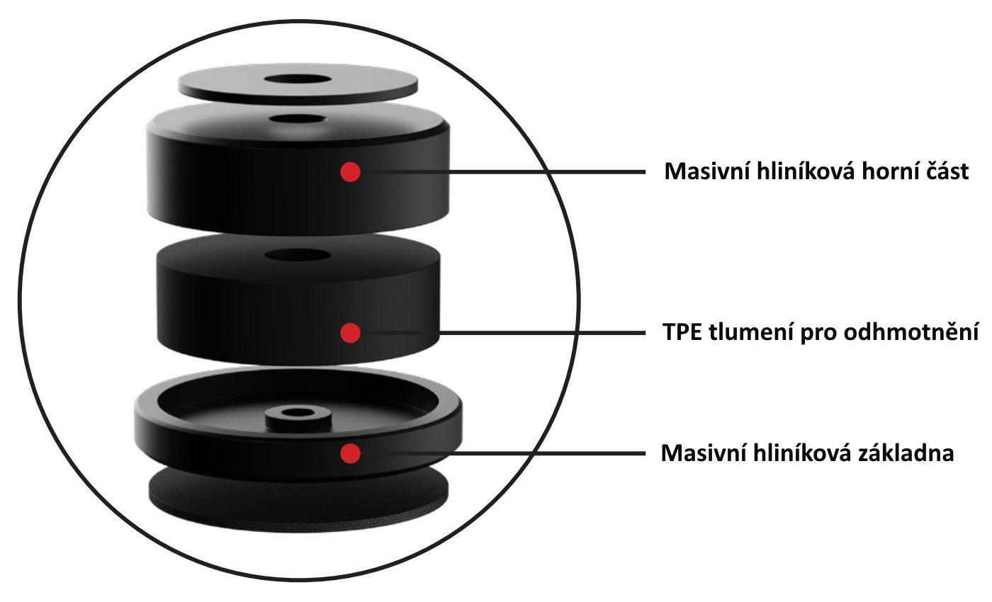 • 3 výškovo nastaviteľné hliníkové nôžky pre zníženie rizika akustickej spätnej väzby
