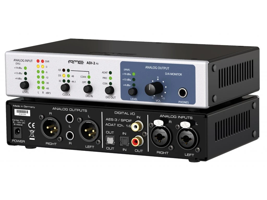 Konverzia funguje samozrejme aj opačným smerom. Kľúčovými parametrami tohto systému sú symetrické vstupy a výstupy, monitoring cez slúchadlový výstup. Technológia SteadyClock pre maximálnu korekciu jitterov a nepresností pri prevode zaisťuje maximálnu kvalitu zvuku pri absolútnej nezávislosti na presnosti a kvalite riadiaceho synchronizačného `clocku`. LED indikácia vstupnej a výstupnej úrovne signálu a stavu syncronizácie podáva užívateľovi všetky dôležité informácie o práci prevodníka. ADI-2 rovnako ako ostatné RME systémy možnosť externého aj interného napájania. Sú akceptované všetky voltáže od 7 do 30 V, AC/DC, bežné aj dobíjacie batérie.