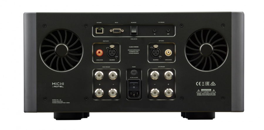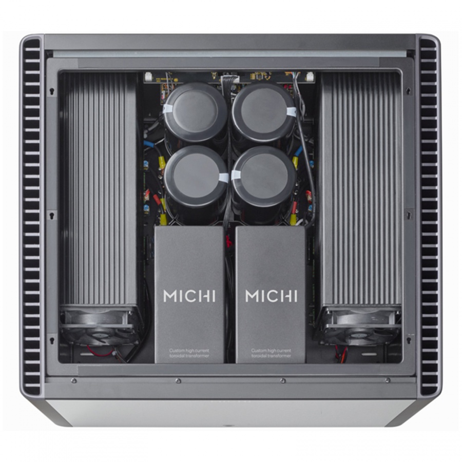 Stereofónny koncový zosilňovač Michi S5 poskytuje 2x 500 W pri 8 ohmoch a dodá tak dostatok výkonu s plnou dynamikou aj zložitým reproduktorovým systémom s nižšou citlivosťou.