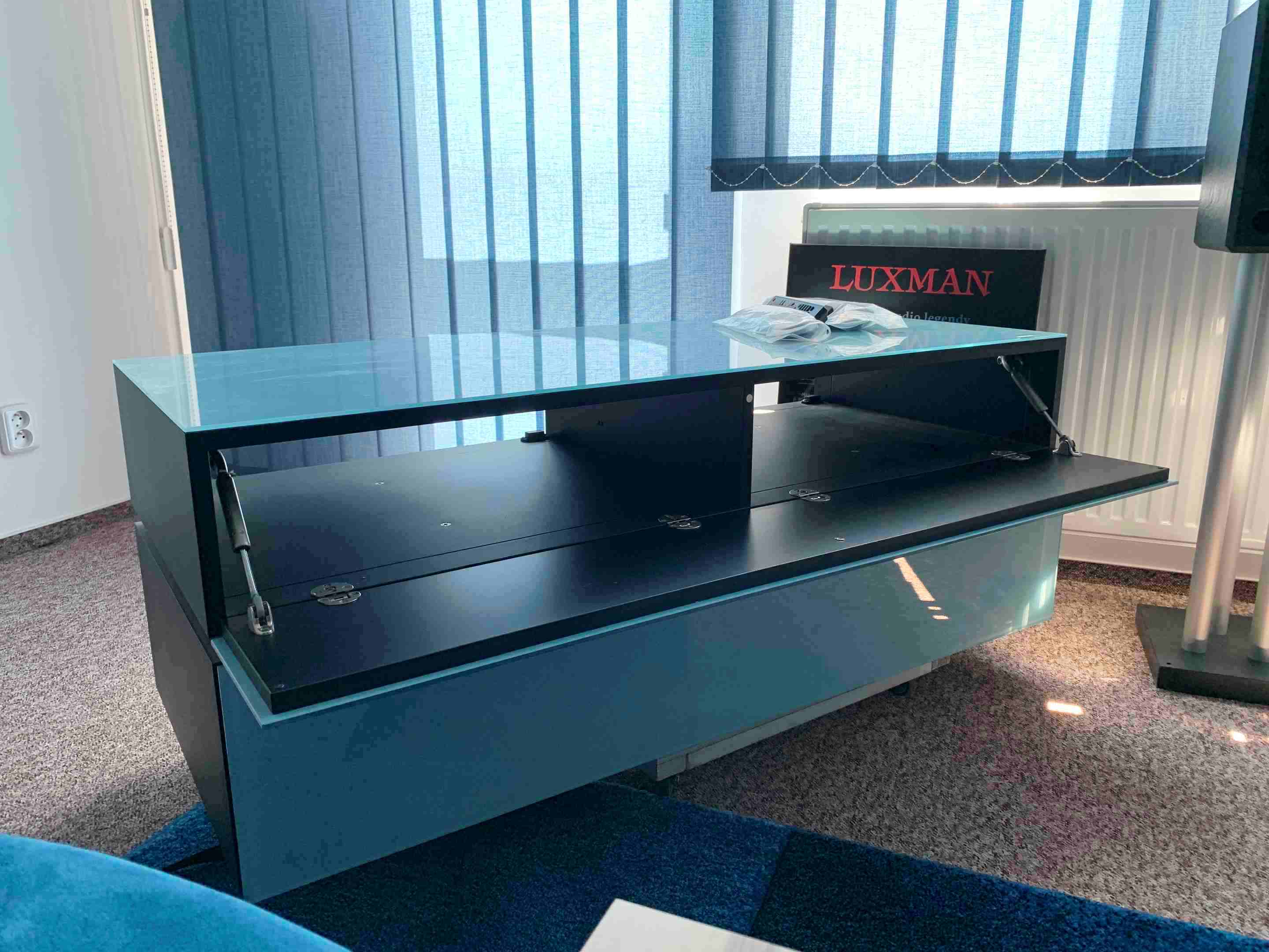 Dizajnový TV stolík na uloženie až 4. komponentov domáceho kina. Čelné výklopné dvierka s tlmiacou mechanikou.