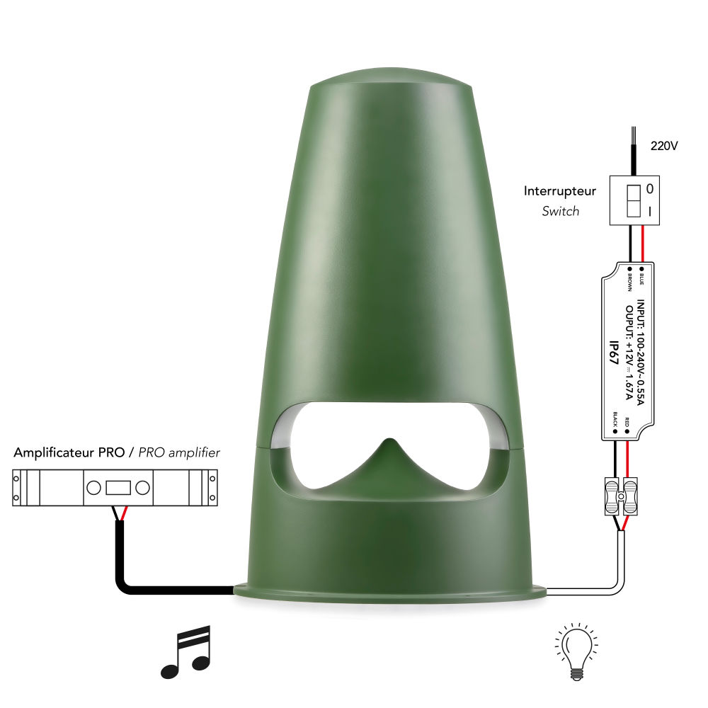 Okolo spodnej časti reproduktora je integrované LED osvetlenie, ktoré vytvára teplú a príjemnú atmosféru – ideálne na večerné posedenie alebo osvetlenie chodníkov. Svetlo funguje nezávisle na zvuku a je napájané pomocou 12 V transformátora. Ovláda sa jednoducho vypínačom – hudba tak nie je podmienkou pre príjemnú atmosféru.
