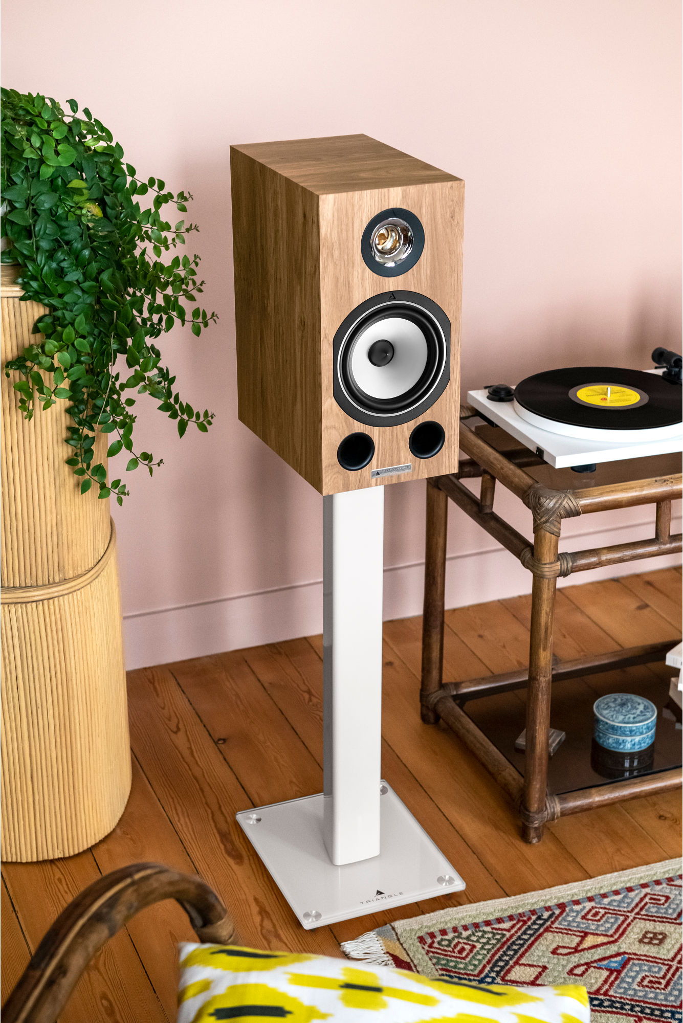Minimalistická estetika stojana pre reproduktory Triangle Stand S05 sa vyznačuje dizajnovým prepojením s radom high-end s pevnou základňou z farebného skla, ktorá je zladená s čiernou alebo bielou povrchovou úpravou.