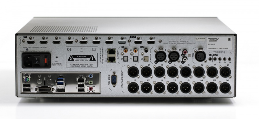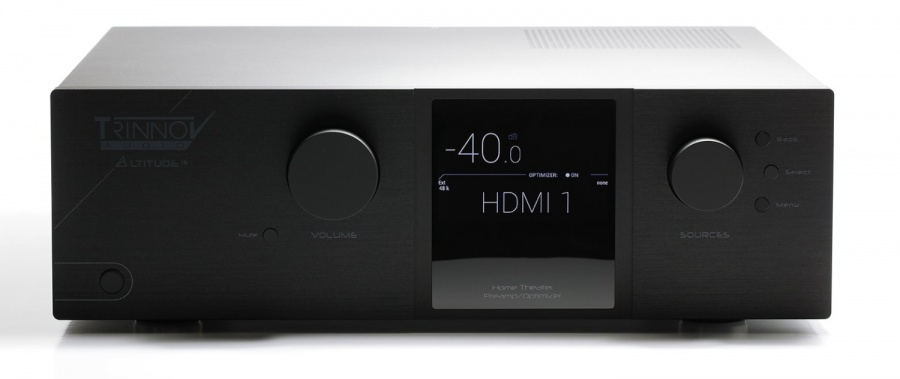 Ako AV procesor (AV predzosilňovač, ak chcete) sme vybrali francúzsku značku Trinnov, konkrétne model Altitude 16 . Išlo o prvý AV komponent na svete, ktorý uriadil väčšie množstvo reproduktorov pre domáce kiná. Konkurenčné AV procesory v oblasti domácich kín boli limitované "len" štyrmi stropnými reproduktormi. S ďalšou nadstavbou - áno, predzosilňovač prepojený s ďalším predzosilňovačom - je Trinnov schopný zriadiť až 64 reproduktorov celkom . Niektoré z nich môžu byť navyše ešte zapojené do bi-ampingu alebo tri-ampingu. Toto "ampingové" riešenie sa používa hlavne pre predné fronty, kedy im týmto zvýšite výkon a zlepšíte výsledný zvuk zostavy v rámci počúvania sterea. Je možné takto posilniť aj centrálny reproduktor - nezabudnite, že pri prehrávaní filmov hrá +-70% všetkých zvukov práve z neho.