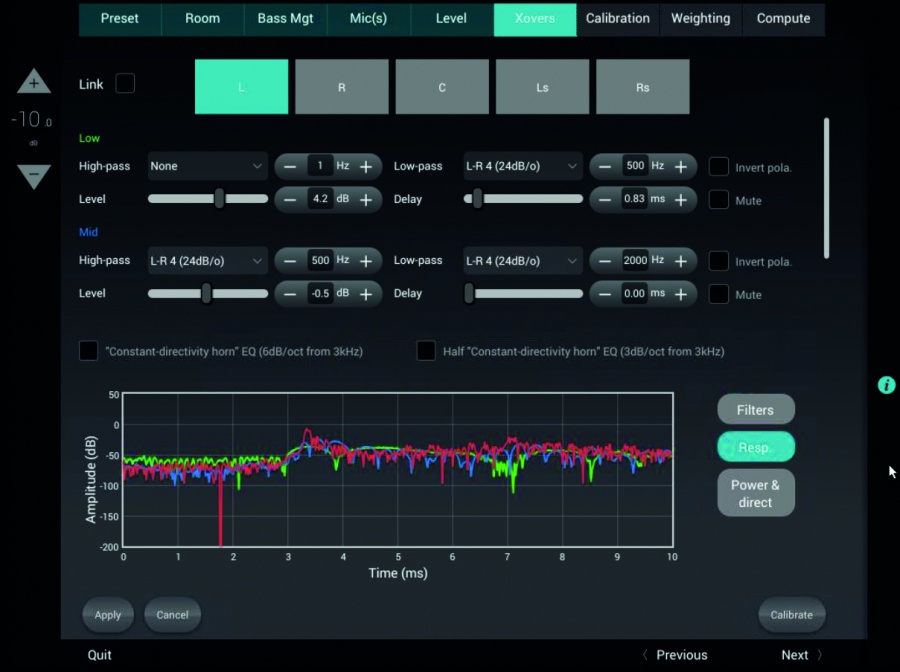 Mikrofón musí byť vo vodováhe a umiestnený presne v mieste počúvania, vektorovo na stred plátna (resp. na stred centrálneho reproduktora). Pomohli sme si laserovou vodováhou. Samotný proces merania a kalibrácie pätnástich reproduktorov trvá zhruba 3 minúty (podľa počtu reproduktorov v meranej zostave).