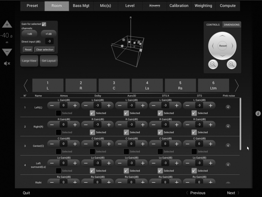 Náš layout. Konfigurácia 7.2.6. Možnosť "pink noise" ktoréhokoľvek reproduktora (šumový test).