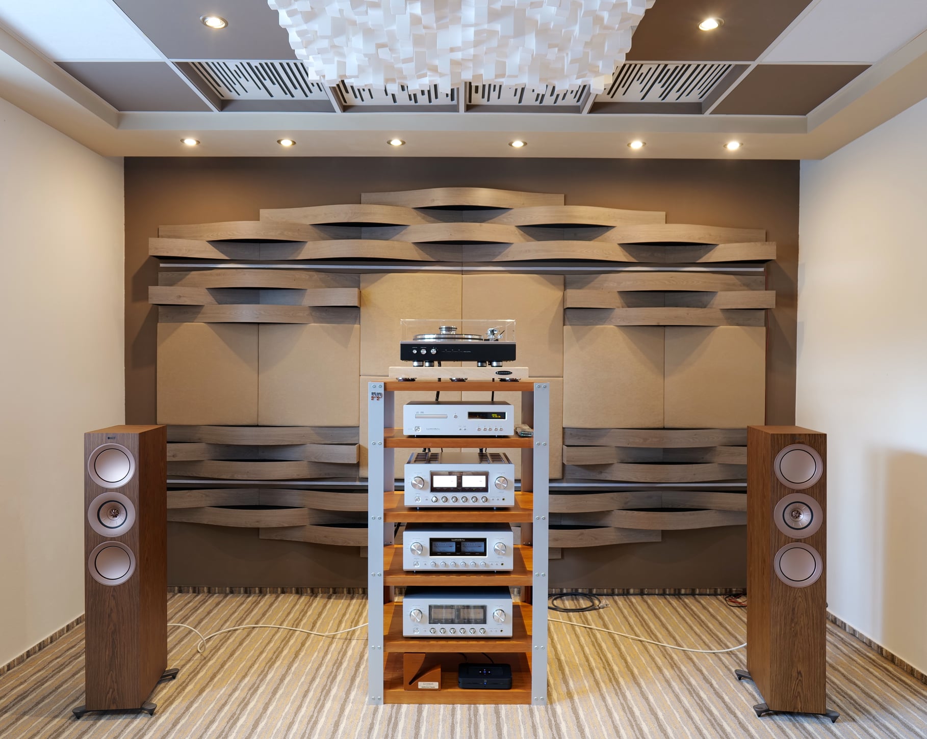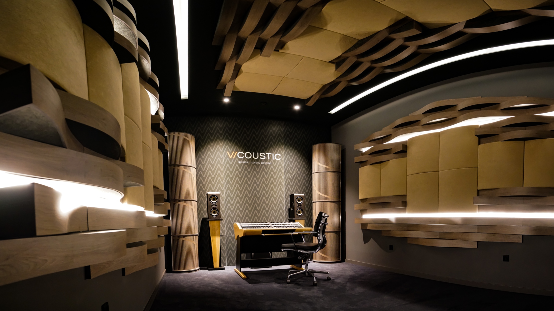 Aktuálna podoba jednej z posluchových miestností v PPHiFi štúdiu, kde bola využitá kombinácia panelov Vicoustic Cinema Round Premium (rok 2026).